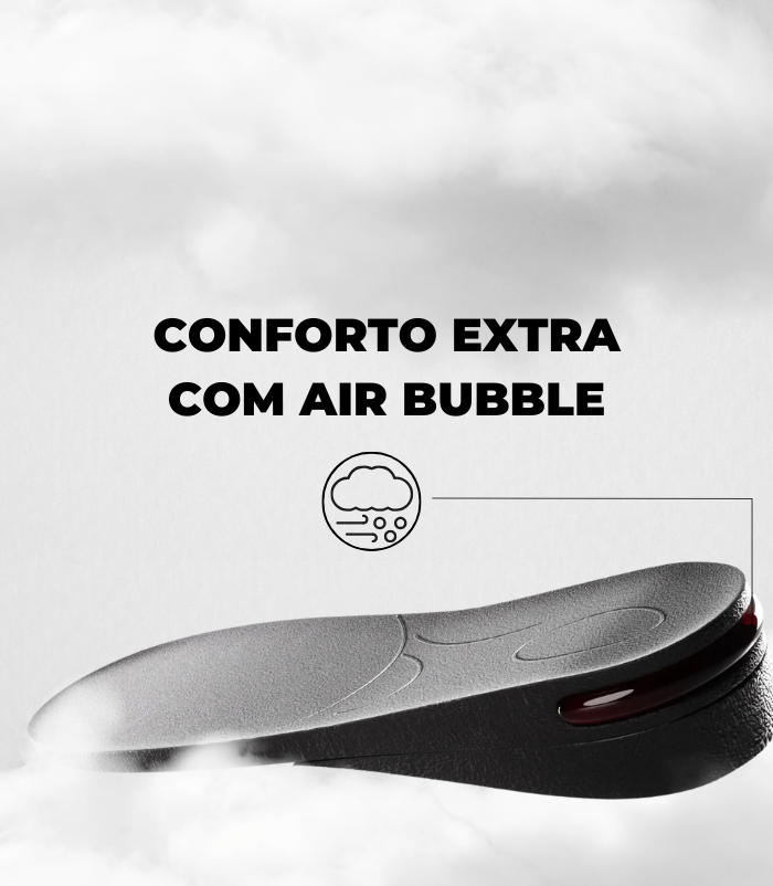 Nossa palmilha foi desenvolvida com a exclusiva tecnologia Air Bubble, que absorve impactos e garante um caminhar macio e confortável. Além claro de fornecer um aumento de altura para elevar a sua confiança